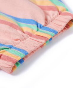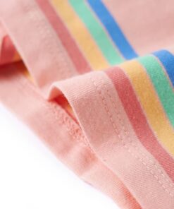 Dit kindershirt heeft korte mouwen met elastische manchetten, een ronde halslijn en een recht model. Op dit perzikkleurige kindershirt staan regenboogstrepen afgebeeld. Het kindershirt met korte mouwen is gemaakt van zacht materiaal met 95% katoen en 5% elastaan, waardoor hij extra comfortabel en ademend is.
