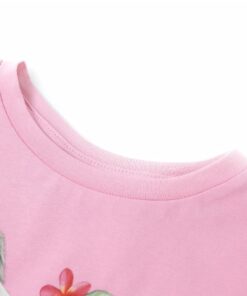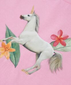 Dit kindershirt heeft korte mouwen met ruches, een ronde halslijn en een recht model. Op dit kindershirt staat een mooie eenhoorn met bladeren en bloemen afgebeeld. Het kindershirt met korte mouwen is gemaakt van zacht materiaal met 95% katoen en 5% elastaan, waardoor het comfortabel en ademend is.