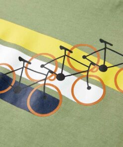 Dit kindershirt heeft korte mouwen, een geribbelde ronde halslijn en een recht model. Op dit kindershirt staan fietsen en kleurrijke brede strepen afgebeeld. Het kindershirt met korte mouwen is gemaakt van 100% katoen, waardoor het comfortabel en ademend is.