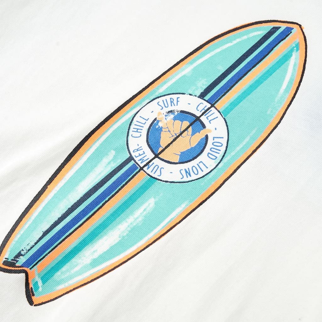 Dit kindershirt heeft korte mouwen, een ronde halslijn en een recht model. Op dit kindershirt staat op de voorkant een kleurrijk surfboard afgebeeld. Het T-shirt is gemaakt van 100% katoen, waardoor het zacht en comfortabel aanvoelt.