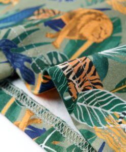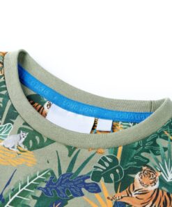 Dit kindershirt heeft korte mouwen, een ronde halslijn en een recht model. Dit kindershirt heeft een patroon van verschillende dieren en bladeren. Het T-shirt is gemaakt van 100% katoen, waardoor het zacht en comfortabel aanvoelt.