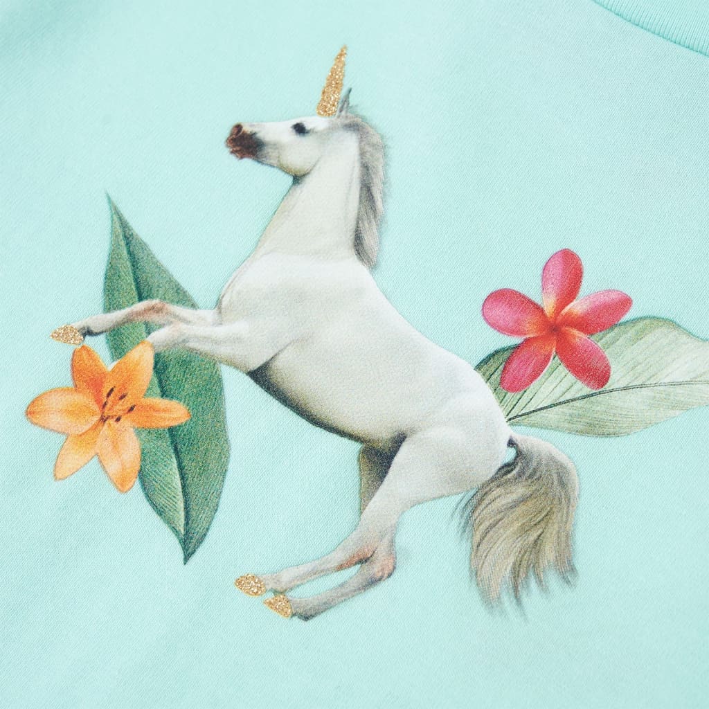 Dit kindershirt heeft korte mouwen met ruches, een ronde halslijn en een recht model. Op dit kindershirt staat een mooie eenhoorn met bladeren en bloemen afgebeeld. Het kindershirt met korte mouwen is gemaakt van zacht materiaal met 95% katoen en 5% elastaan, waardoor het comfortabel en ademend is.