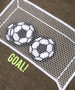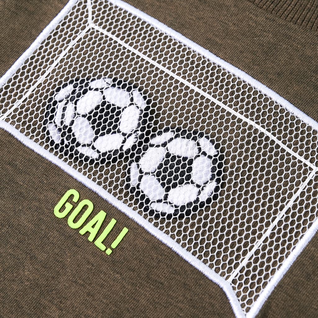 Dit t-shirt heeft lange mouwen, een ronde halslijn en een recht model. Op dit gemêleerd kakikleurige T-shirt staat een voetbaldoel afgebeeld. Het kindershirt met lange mouwen is gemaakt van 80 % katoen en 20% viscose dat met een silicone- en enzymwassing is behandeld, zodat hij zacht en comfortabel aanvoelt.