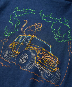 Dit t-shirt heeft lange mouwen, een ronde halslijn en een recht model. Op dit marineblauwe T-shirt staat een terreinwagen en een aap in het bos afgebeeld. Het kindershirt met lange mouwen is gemaakt van 100% katoen dat met een silicone- en enzymwassing is behandeld, zodat hij zacht en comfortabel aanvoelt.
