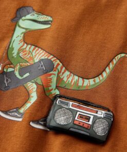 Dit t-shirt heeft lange mouwen, een ronde halslijn en een recht model. Op dit cognackleurige T-shirt staat een dinosaurus met modieuze kleding en sportuitrusting afgebeeld. Het kindershirt met lange mouwen is gemaakt van 100% katoen dat met een silicone- en enzymwassing is behandeld, zodat hij zacht en comfortabel aanvoelt.