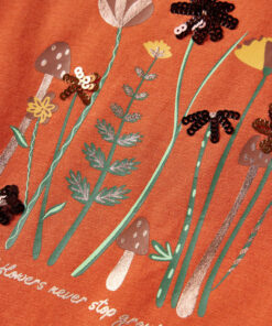 Dit t-shirt heeft lange mouwen, een ronde halslijn en een sleutelgat opening achterin de nek. Op dit oranjebruine t-shirt zijn mooie wilde bloemen afgebeeld. Het kindershirt met lange mouwen is gemaakt van zacht materiaal met 95% katoen en 5% elastaan voor extra comfort en ademend vermogen.