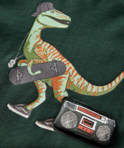 Dit t-shirt heeft lange mouwen, een ronde halslijn en een recht model. Op dit donkergroene T-shirt staat een dinosaurus met modieuze kleding en een sportuitrusting afgebeeld. Het kindershirt met lange mouwen is gemaakt van 100% katoen dat met een silicone- en enzymwassing is behandeld, zodat hij zacht en comfortabel aanvoelt.