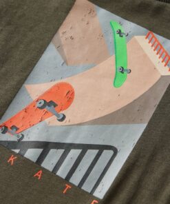 Dit t-shirt heeft lange mouwen, een ronde halslijn en een recht model. Op dit kakikleurige kindershirt staan skateboards afgebeeld. Het kindershirt met lange mouwen is gemaakt van 100% katoen dat met een silicone- en enzymwassing is behandeld, zodat hij zacht en comfortabel aanvoelt.