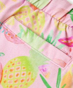 Deze korte broek voor kinderen heeft een elastische tailleband met trekkoord, 2 zijzakken en een paspelzak aan de achterkant. Op deze kindershorts staan allemaal vruchten afgebeeld. De korte broek is gemaakt van zacht materiaal met 92% katoen en 8% elastaan, waardoor hij comfortabel en ademend is.