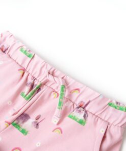 Deze kindershort heeft een elastische tailleband met trekkoord en 2 steekzakken. Deze kindershorts zijn met konijnen, regenbogen en gras bedrukt. De korte broek is gemaakt van zacht materiaal met 92% katoen en 8% elastaan, waardoor hij comfortabel en ademend is.