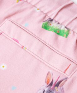 Deze kindershort heeft een elastische tailleband met trekkoord en 2 steekzakken. Deze kindershorts zijn met konijnen, regenbogen en gras bedrukt. De korte broek is gemaakt van zacht materiaal met 92% katoen en 8% elastaan, waardoor hij comfortabel en ademend is.