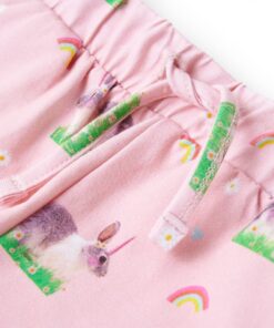 Deze kindershort heeft een elastische tailleband met trekkoord en 2 steekzakken. Deze kindershorts zijn met konijnen, regenbogen en gras bedrukt. De korte broek is gemaakt van zacht materiaal met 92% katoen en 8% elastaan, waardoor hij comfortabel en ademend is.