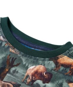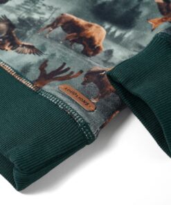 Deze trui voor kinderen heeft lange mouwen, een ronde hals en geribbelde randen aan de manchetten, halslijn en onderkant. Op de kindertrui staan allemaal runderen, adelaars en bos afgebeeld. De kindertrui is gemaakt van zacht materiaal met 95% katoen en 5% elastaan, waardoor hij comfortabel en ademend is.