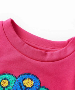 Deze trui voor kinderen heeft lange mouwen, een ronde hals en geribbelde randen aan de manchetten, halslijn en onderkant. Op de trui staat een glinsterende pauw van pailletten. De trui is gemaakt van 95% katoen en 5% elastaan, waardoor hij comfortabel is en een ademend vermogen heeft.