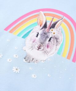 Deze trui voor kinderen heeft lange mouwen, een ronde hals en geribbelde randen aan de manchetten, halslijn en onderkant. Op de kindertrui staan een regenboog en een konijn afgebeeld. De kindertrui is gemaakt van katoen en elastaan, waardoor hij comfortabel en ademend is.