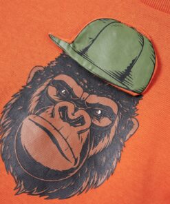 Deze trui voor kinderen heeft lange mouwen, een ronde hals en geribbelde randen aan de manchetten, halslijn en onderkant. Op deze kindertrui staat een gorilla met een pet afgebeeld. De kindertrui is gemaakt van zacht materiaal met 92% katoen en 8% polyester, waardoor hij comfortabel en ademend is. De zachte fleecevoering zorgt voor extra warmte.