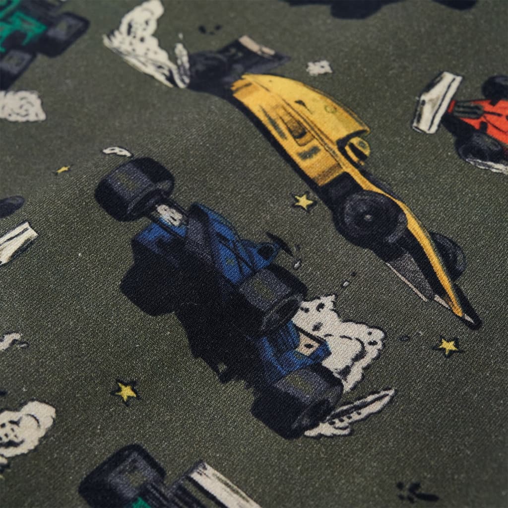 Deze trui voor kinderen heeft lange mouwen, een ronde hals en geribbelde randen aan de manchetten, halslijn en onderkant. Op de kindertrui staan racewagens afgebeeld. De kindertrui is gemaakt van 95% katoen en 5% elastaan, waardoor hij comfortabel is en een ademend vermogen heeft.