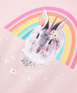 Deze trui voor kinderen heeft lange mouwen, een ronde hals en geribbelde randen aan de manchetten, halslijn en onderkant. Op de kindertrui staan een regenboog en een konijn afgebeeld. De kindertrui is gemaakt van katoen en elastaan, waardoor hij comfortabel en ademend is.