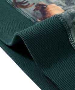 Deze trui voor kinderen heeft lange mouwen, een ronde hals en geribbelde randen aan de manchetten, halslijn en onderkant. Op de kindertrui staan allemaal runderen, adelaars en bos afgebeeld. De kindertrui is gemaakt van zacht materiaal met 95% katoen en 5% elastaan, waardoor hij comfortabel en ademend is.