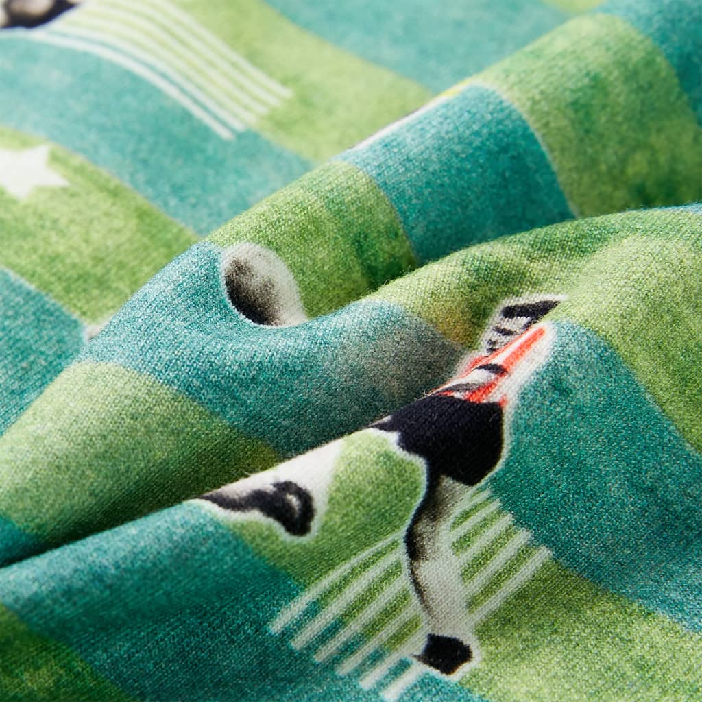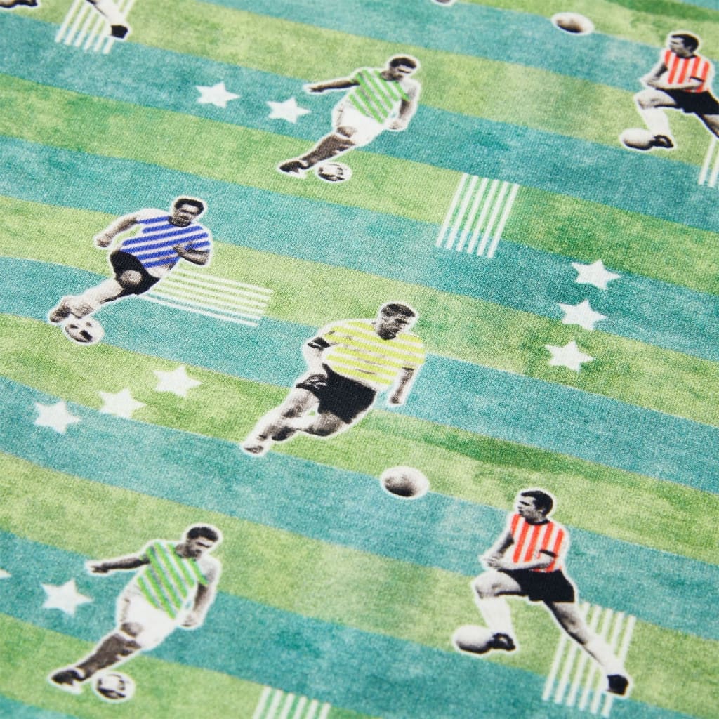 Deze kindertrui heeft lange mouwen, een ronde hals en geribbelde randen aan de manchetten, halslijn en onderkant. De trui is gemaakt van 95% katoen en 5% elastaan, waardoor hij comfortabel is en een ademend vermogen heeft. Dankzij de zachte fleecevoering is de kindertrui extra warm. De kindertrui heeft een patroon van spelende voetballers.