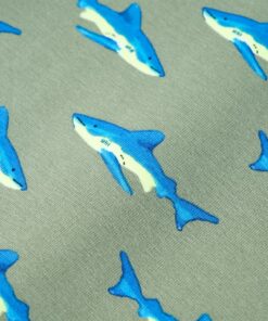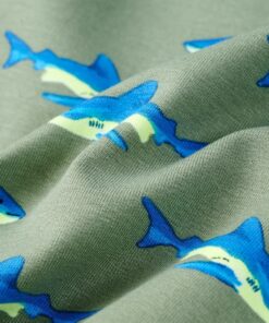 Deze trui voor kinderen heeft lange mouwen, een ronde hals en geribbelde randen aan de manchetten, halslijn en onderkant. Op de kindertrui staan haaien afgebeeld. De kindertrui is gemaakt van zacht materiaal met 95% katoen en 5% elastaan, waardoor hij comfortabel en ademend is.