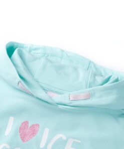 Deze kindertrui met capuchon heeft lange mouwen en een elastische zoom. Deze lichtzeeblauwe kindertrui heeft tekst op de borst en op de zoom zit een leuk strikje. De kindertrui met capuchon is gemaakt van 95% katoen en 5% elastaan, waardoor hij zacht en comfortabel aanvoelt.