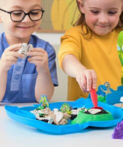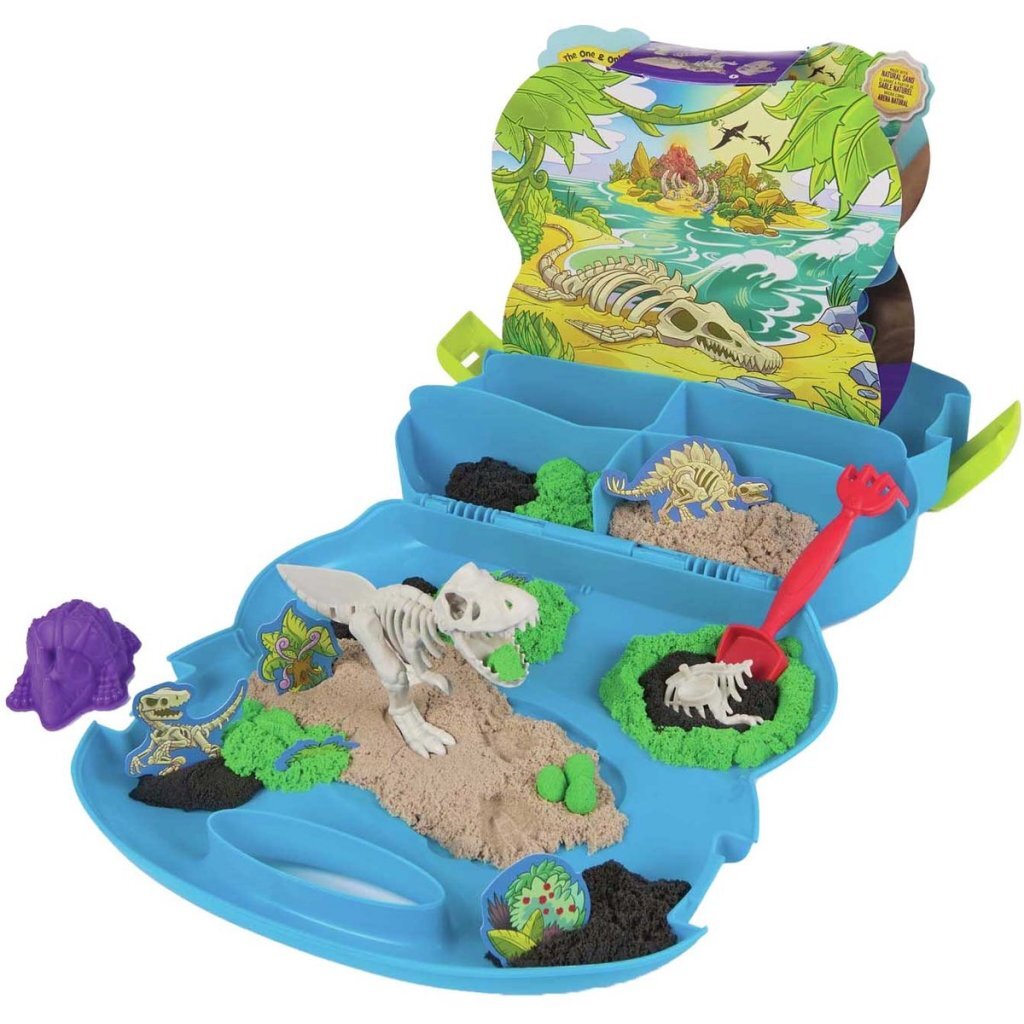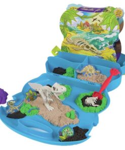 Deze set bestaat uit 680 g Kinetic Sand in 3 kleuren (natuurlijk bruin, zwart en neongroen), 5 fossielen die je ook als gereedschap kunt gebruiken, een schep, decoratieve figuren en een dubbelzijdige achtergrond. T-rex graven stimuleert eindeloos fantasierijk spelen terwijl de kinderen aan het graven en harken zijn naar verborgen schatten. Elk T-rex fossiel heeft een unieke zandfunctie: stamp pootafdrukken met de poten, hark met de klauwen, snijd het zand met de staart en kneed eieren met de ribben. Kinderen kunnen hun set versieren en omtoveren tot een prehistorische wereld met de achtergrond. Ze kunnen ook alle fossielen met elkaar verbinden om een mega T-rex te bouwen. Na het spelen kun je alles inpakken in de opbergdoos. Het One and Only Kinetic Sand is gemaakt van natuurlijk zand. Het is gemakkelijk op te ruimen, want het blijft aan zichzelf plakken. Geschikt voor kinderen vanaf 3 jaar.
