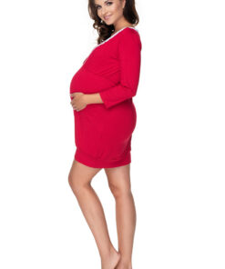 Zwangerschapsnachtjapon met decoratieve guipure en 3/4 mouwen. Halsuitsnijding met inzetstuk om borstvoeding te vergemakkelijken. Kan ook na de zwangerschap gedragen worden.