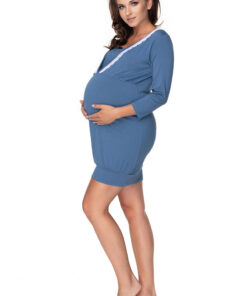 Zwangerschapsnachtjapon met decoratieve guipure en 3/4 mouwen. Halsuitsnijding met inzetstuk om borstvoeding te vergemakkelijken. Kan ook na de zwangerschap gedragen worden.