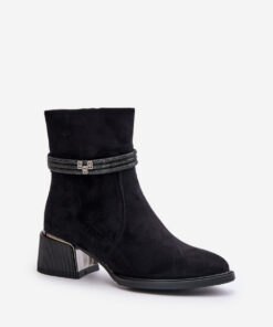 Dameslaarzen van hoogwaardig eco-suède. Op een lage hak. Amandelvormige teen. Verwarmde binnenkant met schoenendeken. Sluiting met rits. De belangrijkste troef van dit model zijn de glanzende strepen op het bovenwerk.