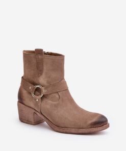 Dameslaarzen van natuurlijk suède. Op een lage hak. Amandelvormige teen. Binnenkant van vilt om warm te blijven op koudere dagen. Sluiting met rits. Strepen op de bovenkant. Dit model past perfect bij zowel broeken als jurken.
