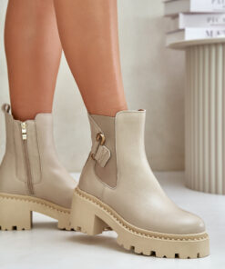 Enkellaarzen gemaakt van hoogwaardig natuurlijk leer. Gesloten met een rits. Gevoerd met vilt, wat zorgt voor comfort op koude dagen. Het model heeft afgeronde neuzen en is geplaatst op een stevige hak, wat stabiliteit toevoegt. Het belangrijkste kenmerk is de versiering in de vorm van een gesp.