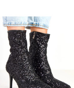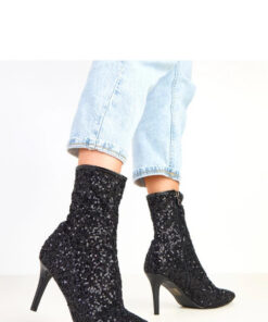Schitterende enkellaarsjes voor dames gemaakt van elegante stof en bedekt met pailletten over de hele oppervlakte, die het licht prachtig reflecteren en de aandacht trekken. De slanke puntige neus en de 8,5 centimeter hoge stilettohak geven ze een uitzonderlijke lichtheid en elegantie. Het model met een schacht van 18 cm benadrukt op een indrukwekkende manier de enkel, terwijl de praktische ritssluiting het aan- en uittrekken vergemakkelijkt. Het interieur is afgewerkt met zachte stof, wat zorgt voor comfortabel dragen ondanks het elegante karakter van de schoenen. Dit zijn schoenen voor speciale gelegenheden, perfect voor avondkleding, cocktailjurken of outfits waarin glans en glamour centraal staan.