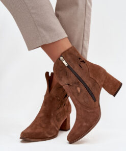 Dameslaarzen gemaakt van natuurlijk suède. Het open patroon geeft ze originaliteit en lichtheid, benadrukt het unieke karakter van dit model. De blokhak zorgt voor stabiliteit en comfort, en verlengt tegelijkertijd mooi de silhouet. Puntige neuzen voegen een elegant accent toe, waardoor de schoenen er uiterst elegant uitzien. Dankzij de ritssluiting zijn ze gemakkelijk aan en uit te trekken, wat het dagelijks gebruiksgemak vergroot. Dit schoeisel is ideaal voor het tussenseizoen en zal zowel casual als meer elegante outfits perfect aanvullen.