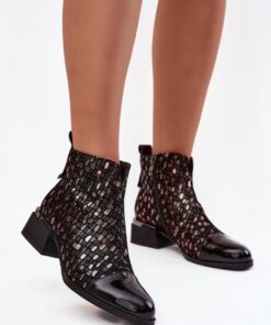 Elegante damesschoenen gemaakt van een combinatie van gepatenteerd natuurlijk leer en suède zijn een uniek voorstel voor vrouwen die originaliteit en hoge kwaliteit waarderen. De combinatie van twee soorten materialen geeft een uitgesproken karakter, en het glanzende patroon op de schacht trekt de aandacht en benadrukt hun elegantie. Het model is geplaatst op een stabiele blokhak die de silhouet voorzichtig omhoog brengt, met comfortabel dragen gedurende de hele dag. Het interieur, gevoerd met een schoenenvoering, garandeert thermisch comfort op koelere dagen, waardoor de laarzen perfect zijn voor het herfst-winterseizoen. Deze schoenen zullen zowel dagelijkse outfits met jeans als meer verfijnde sets met een rok of jurk perfect aanvullen, waardoor ze elegantie toevoegen.