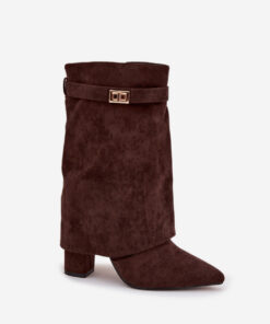 Stijlvolle enkellaarsjes gemaakt van zacht imitatiesuède zijn de perfecte keuze voor koelere dagen. Het model onderscheidt zich door de omgevouwen schacht, die subtiel over de hak valt en het geheel een uniek karakter geeft. De schoenen hebben een puntige neus en een stabiele blokhak die de silhouet mooi verslankt en comfortabel draagcomfort biedt. Voor gemakkelijk gebruik zijn ze voorzien van een rits en het interieur is gevoerd met een aangename binnenvoering. Boven aan de schacht is een decoratief riempje aangebracht dat een modieus accent toevoegt. Deze enkellaarsjes completeren zowel casual als elegante outfits, perfect voor broeken, jurken en rokken.