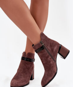 Dameslaarzen gemaakt van natuurlijk suède zijn een combinatie van elegantie en comfort. Het model op een stabiele pilaarhak zorgt voor comfortabel dragen gedurende de hele dag, terwijl het gevoerde interieur ervoor zorgt dat ze perfect zijn voor koelere dagen. De schoenen zijn voorzien van een rits, wat het aan- en uittrekken vergemakkelijkt. De decoratieve riem op de schacht voegt charme toe en benadrukt de stijlvolle, vrouwelijke uitstraling van het model. Dit tijdloze enkellaarzen zullen zowel dagelijkse als meer elegante outfits perfect aanvullen.