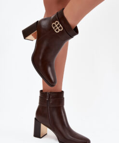 Laarzen voor dames gemaakt van eco-leer. Het model is geplaatst op een stabiele hak in de vorm van een zuil, versierd met een gouden, spiegelachtig element dat het geheel een uniek karakter geeft. De schoenen zijn voorzien van een rits, wat zorgt voor gemak bij het aantrekken en een perfecte pasvorm. De bovenkant van de schacht is versierd met een riem met een decoratief detail, wat een subtiele, stijlvolle accent is. Dit zijn universele laarzen die zowel in elegante als dagelijkse outfits goed zullen passen.