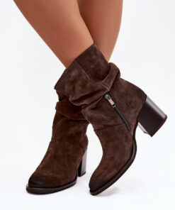 Dameslaarzen gemaakt van natuurlijk suède zijn een combinatie van elegantie en comfort in een moderne uitvoering. Het model op een stabiele pilaarhak maakt de silhouet subtiel slanker en zorgt tegelijkertijd voor draagcomfort. De schoenen zijn instappers en sluiten met een rits, wat het aantrekken vergemakkelijkt, en de geplooide schacht geeft ze een modieus, licht relaxte uitstraling. Dit stijlvolle model zal zowel in casual outfits als in elegante dagelijkse outfits perfect passen.