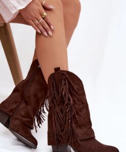 Laarzen gemaakt van eco-suède zijn een stijlvol model geïnspireerd op de westernsfeer. Kenmerkende franjes geven ze lichtheid en een spectaculaire beweging, terwijl de afgekapte pilaarhak en puntige neuzen hun unieke snit benadrukken. De ritssluiting vergemakkelijkt het aantrekken, en de voering met schuim bedekt met zacht materiaal zorgt voor comfort en warmte op koudere dagen.