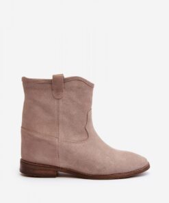 Dameslaarzen van natuurlijk suède. Op een platte hak met een verborgen anker. Afgeronde teen. Binnenzool van natuurlijk leer zorgt voor comfort tijdens het gebruik. Combineer dit klassieke model met vele stylings!