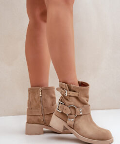 Laarzen gemaakt van natuurlijk suède zijn de perfecte keuze voor elke gelegenheid. Met een lage hak bieden ze comfort en stabiliteit tijdens het lopen. De afgeronde neuzen voegen een subtiel karakter toe. Het model is voorzien van een rits, wat het aantrekken vergemakkelijkt. De schacht is versierd met een opvallende combinatie van banden die een stijlvol accent toevoegen. Deze laarzen zijn perfect voor dagelijkse outfits, waarbij elegantie en comfort worden gecombineerd.