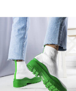 Witte soklaarzen met groene zool Cali zijn een voorstel voor mensen die comfort en stijl waarderen. De laarzen zijn instappers, gemaakt van elastische stof die zich aan de vorm van de voet aanpast. De schacht reikt tot halverwege de kuit en is versierd met een band in de kleur van de zool, wat de laarzen originaliteit geeft. De dikke, kleurrijke zool met profiel zorgt voor stabiliteit en draagcomfort. De schoenen hebben een ronde neus en de maten zijn standaard, dus het is de moeite waard om je eigen maat te kiezen. Ideaal voor koude dagen, omdat ze gevoerd zijn. Laarzen op een dikke zool zijn een trend van de laatste seizoenen die zeker karakter zullen toevoegen aan elke outfit.