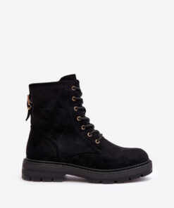 Klassieke dames enkellaarzen gemaakt van imitatie suède. Geplaatst op een platform en met een platte hak. Dit model heeft een rits en extra vetersluiting. Ronde neuzen. De verstevigde hiel zorgt voor de juiste stabilisatie van de voet. Aan de achterkant van de schacht zit een korte riem met gesp. Je moet ze zeker hebben!