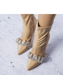 De beige Caisse laarzen zijn een elegante schoen met naaldhak, perfect voor avonduitstapjes of speciale gelegenheden. Ze zijn gemaakt van gladde stretchstof, hebben een getailleerd bovenwerk tot aan de enkels en een spitse neus. De laarzen sluiten met een rits aan de binnenkant van het bovenwerk, waardoor ze gemakkelijk aan te trekken zijn. Ze zijn rijkelijk versierd met zirkonia’s en geven glans en elegantie aan elke outfit. De laarzen zijn ideaal voor mensen met een smalle voet. De nummering is standaard, dus het is de moeite waard om je maat te kiezen. De isolatie is niet te dik, dus de laarzen zijn vooral fijn op koudere herfst- en winterdagen. De zool is gemaakt van kunststof in beige en de vetersluiting maakt het geheel nog aantrekkelijker. De Caisse laarzen zijn een must-have voor elke liefhebber van vintage mode en elegante stijl.