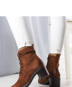 Bruine enkellaarsjes Sanlow zijn ideaal schoeisel voor koele herfstdagen. Ze hebben een standaard hakhoogte en een vierkante neus, en rond de enkel zijn ze omwikkeld met veters, wat ze karakter geeft. Gemaakt van suède-look kunstleer, ze hebben een hoge schacht met een ritssluiting aan de zijkant en vetersluiting aan de voorkant. De vierkante neus is licht gevoerd met een voetbed.