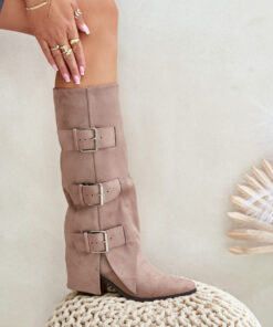 Stijlvolle dames laarzen gemaakt van imitatie suède. Geplaatst op een hak in de vorm van een paal. Spitse neuzen. Gevoerd met schoenen fleece. Het belangrijkste voordeel van dit model is de omgeslagen schacht versierd met gouden gespen. Instapmodel met extra rits aan de onderkant. Ze zullen perfect passen bij outfits met losse blazers, rokken en jurken! Je moet ze zeker hebben!