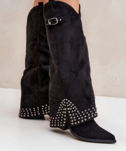 Stijlvolle damesschoenen gemaakt van kunstsuède. Het model onderscheidt zich door een omgeslagen schacht versierd met strass en een elegante gesp. Puntige neuzen geven de schoenen een chique uitstraling en benadrukken het unieke ontwerp ervan. Een ideale keuze voor vrouwen die mode en originaliteit waarderen in hun dagelijkse outfits.