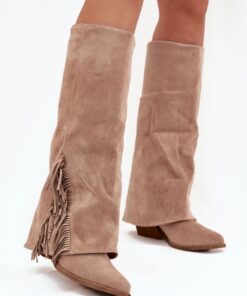 Ingeschoven cowboylaarzen van imitatiesuède, met een hak in de vorm van een paaltje, zijn een combinatie van comfort en stijl. Puntige neuzen voegen elegantie toe, terwijl de schacht versierd met franjes een lichte, boho accent toevoegt. Perfect voor casual stijlen, ze passen goed bij jurken, rokken en broeken, waardoor elke outfit een vleugje cowboy-charme krijgt.