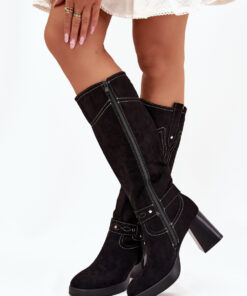 Dameslaarzen gemaakt van imitatiesuède. Geplaatst op een paalhak. Met ritssluiting voor gemakkelijk aan- en uittrekken, en gevoerd met een voering voor warmte op koudere dagen. De schacht reikt tot aan de knie en is versierd met subtiele elementen van riempjes en stiksels, die de laarzen karakter geven. Deze laarzen zijn een uitstekende keuze voor zowel elegante als casual outfits, met comfort en een modieuze uitstraling.